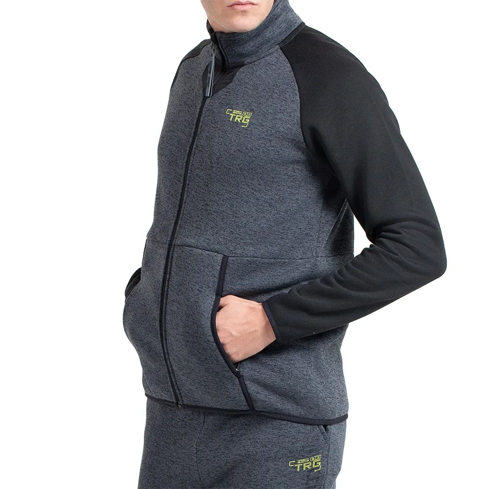 It features a central zipper, straight collar, cuffs and hem finished with elastic trim, side pockets with zippers, and a trg graphic (alluding to the purpose of the line) printed on the side.