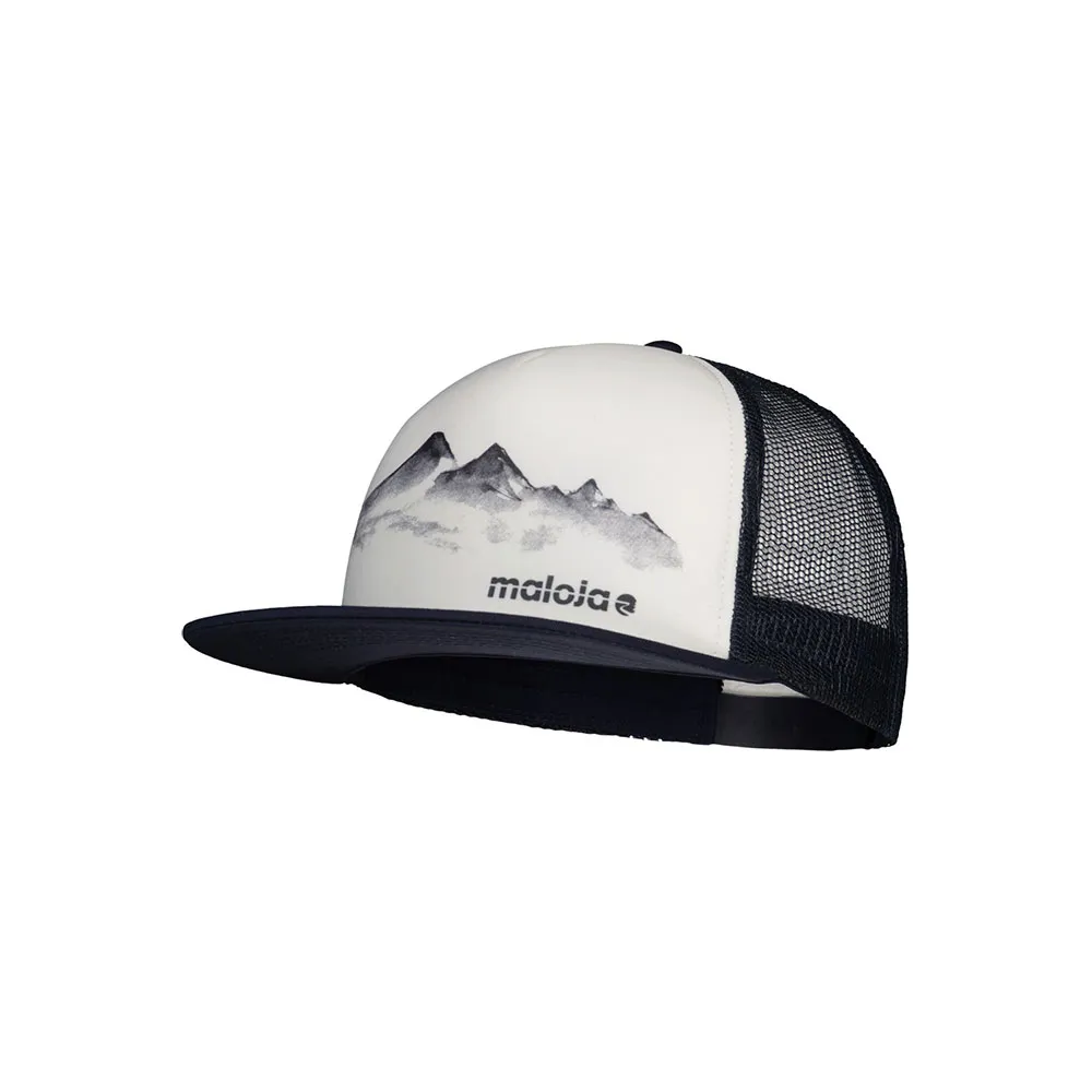 Classic trucker cap with flat visor, mesh back, adjustable fit and LA VIA mountain print.
