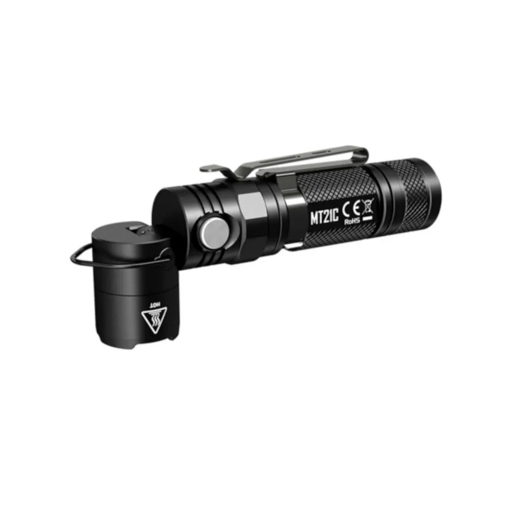 The NiteCore flashlight MT21C Cree XP-L HD V6 LED with tilting head - Black makes use of the CREE XP-L HD V6 LED with a maximum output of 1000 lumens for 8500 candlepower and a maximum beam distance of 184 metres. The 5 different light levels and 3 special modes are adjusted via the single-sided switch.