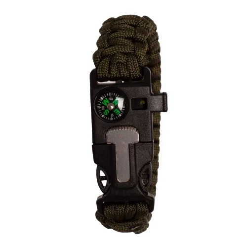 Compass bracelet perfect for outdoor activities, braided with parachute cord. It has a buckle clasp and also includes a compass, whistle and flint.