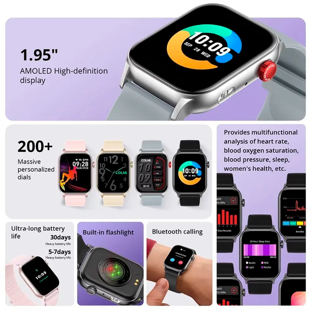 Sumérgete en la impresionante pantalla AMOLED de 1.96” del COLMI P78, que ofrece colores vibrantes y detalles nítidos en un diseño ultradelgado y ligero. Este elegante smartwatch plateado es tu compañero de bienestar completo, con sensores avanzados para el seguimiento de la frecuencia cardíaca, el oxígeno en sangre y el sueño. Alcanza tus objetivos de fitness con más de 100 modos deportivos, ilumina la oscuridad con una linterna incorporada y disfruta de hasta 7 días de duración de la batería. Mantente conectado con las notificaciones y toma el control de tu salud y forma física con estilo