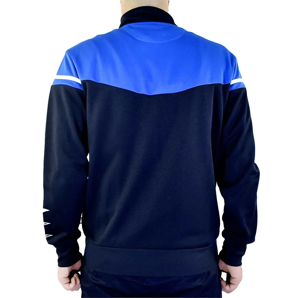 El chándal Sender de Legea incluye una chaqueta bicolor con detalles en contraste, logotipo bordado en el pecho y el brazo, y bolsillos frontales.