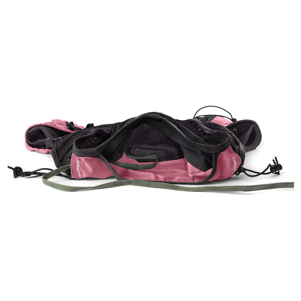 El chaleco cuenta con compartimentos para una bolsa de hidratación, bidones blandos y fijaciones para bastones de correr.