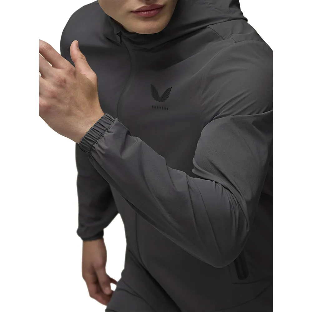 La capuche en trois parties et le col cheminée assurent une couverture toute la journée pendant les séances d´entraînement pluvieuses - disponible en deux combinaisons de couleurs élégantes : noir et gris acier.