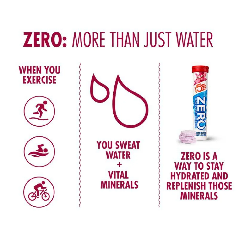 ZERO est une boisson électrolytique rafraîchissante, au goût agréable et sans sucre, avec zéro calorie pour l´exercice et tout au long de la journée. Il suffit de déposer le comprimé d´hydratation dans votre bouteille pour remplacer efficacement les électrolytes perdus par la transpiration. Chaque comprimé effervescent se dissout rapidement dans l´eau, la transformant en une boisson croquante et fruitée à saveur de baies qui étanche votre soif et soutient les besoins de votre corps.