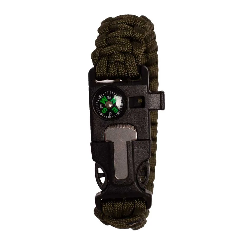 Bracelet boussole parfait pour les activités de plein air, tressé avec de la corde de parachute. Il possède un fermoir à boucle et comprend également une boussole, un sifflet et un silex.
