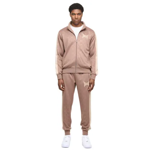 Tracksuit with contrasting details such as 3D rubber badges and contrasting inserts on the shoulders, sleeves and trouser legs. There are zip pockets on both the jacket and trousers. The entire fabric has been embossed so that the Tapout brand logo is visible everywhere. The back is adorned with a large print.