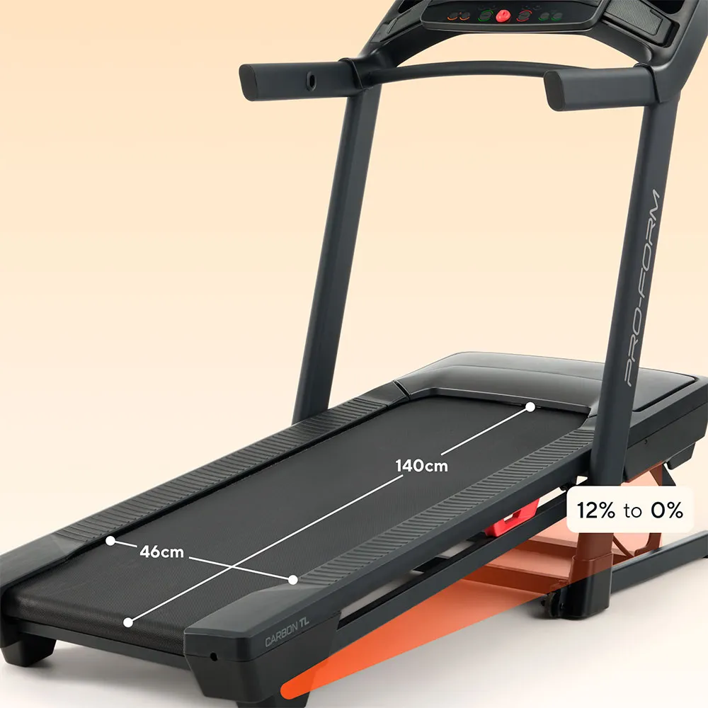 ProForm Carbon TLS loopband voor thuis wandelen, hardlopen en hellingsworkouts. Als fitness leuk en gemakkelijk zou zijn, zouden we allemaal in topvorm zijn. Dat is wat de ProForm Carbon TLS loopband en iFIT Train-lidmaatschap (apart verkrijgbaar) u bieden. Samen creëren ze een handige trainingservaring die leuk, effectief is en vanuit huis kan worden gedaan. De compacte en gebruiksvriendelijke apparaten van ProForm, in combinatie met de trainingen en technologie van iFIT, maken fitness voor iedereen binnen handbereik. Over de Carbon TLS: log in op uw iFIT-account op uw eigen apparaat en verbind het met de Carbon TLS. Uw iFIT-startpagina toont de volgende training in uw gepersonaliseerde plan. Terwijl u traint, volgt iFIT uw prestaties en verandert automatisch uw helling van 0-12% en 0-16 km/u om uw voorkeuren te weerspiegelen, zodat elke training handsfree en gepersonaliseerd is. Voeg uw eigen Bluetooth-hartslagmeter toe en iFIT kan automatisch uw trainingsintensiteit aanpassen om u in de juiste zone te houden. De ProShox™-demping is ontworpen om schokken te absorberen tijdens wandelen, hardlopen en joggen. Wanneer uw training is voltooid, kunt u de loopband eenvoudig opvouwen om de ruimte in uw kamer te maximaliseren. Over iFIT: iFIT-trainers zijn professionele atleten, fitnessexperts en meer. Ze weten hoe ze mensen op alle niveaus kunnen helpen zichzelf te pushen om blijvende resultaten te behalen. iFIT biedt meer dan 10.000 trainingen en is ´s werelds grootste bibliotheek met buitentrainingen. Volg de trainingen op uw eigen apparaat en dompel uzelf onder in verbluffende locaties en prachtige culturen op alle zeven continenten. iFIT-trainers zijn er om u te helpen met uw vorm, u gemotiveerd te houden om sterk te eindigen en u te leren over elke wereldwijde locatie, zodat u betrokken blijft bij korte en lange trainingen. Sluit uw apparaat aan op de USB-C-poort om het opgeladen te houden, hoe lang u ook traint.