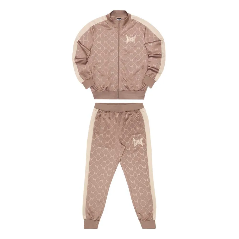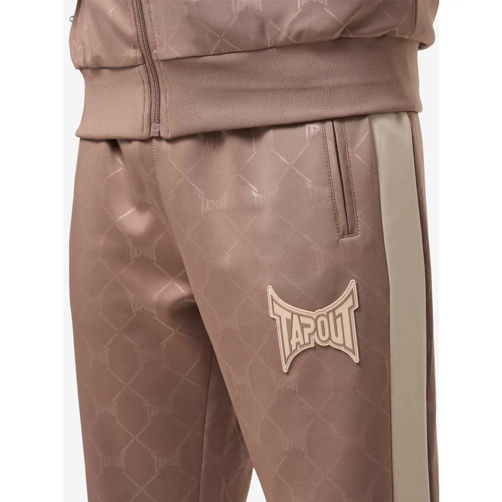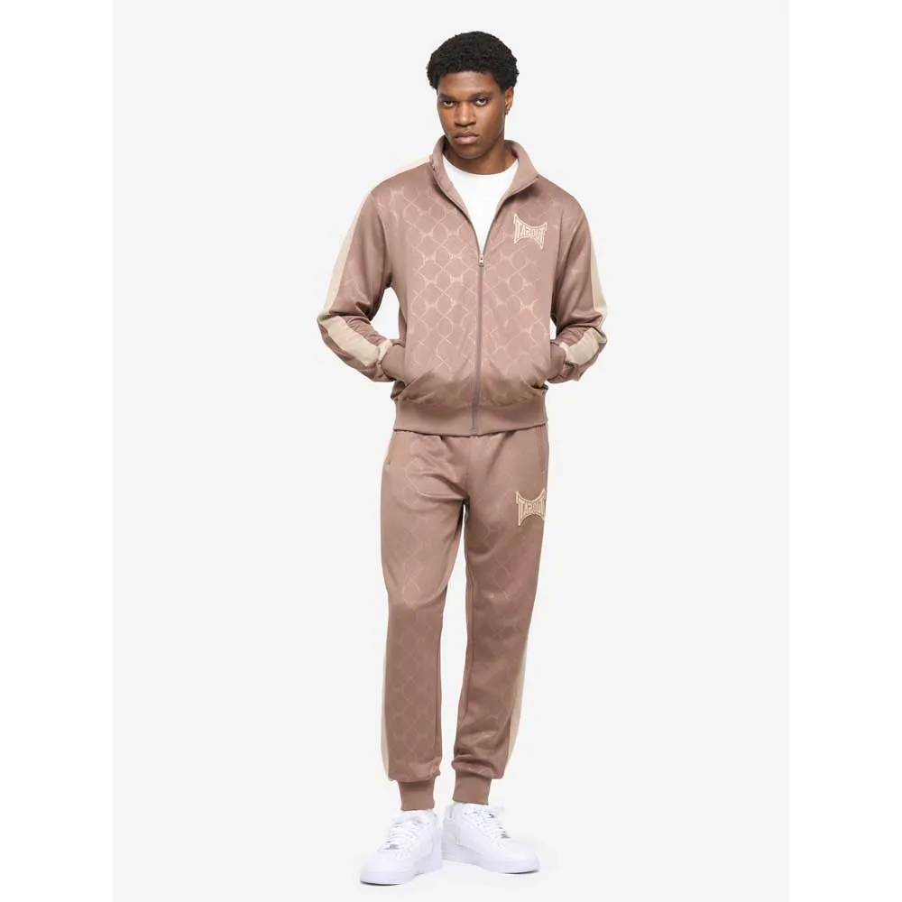 Tracksuit with contrasting details such as 3D rubber badges and contrasting inserts on the shoulders, sleeves and trouser legs. There are zip pockets on both the jacket and trousers. The entire fabric has been embossed so that the Tapout brand logo is visible everywhere. The back is adorned with a large print.