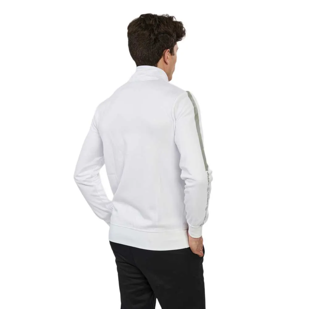 Het UMBRO Kabue Trainingspak in het wit is een stijlvol en veelzijdig stuk herenkleding dat is ontworpen voor zowel comfort als functionaliteit. Het is onderdeel van een compleet trainingspakensemble met bijpassende broek, voor een gecoördineerde look.