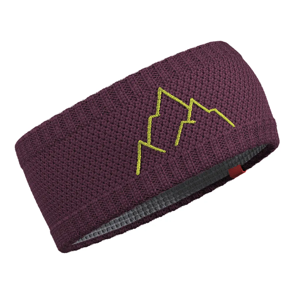 Vinterstrikket pannebånd i merinoull med fargekontrastbroderi og en funksjonell syntetisk fôring på innsiden.