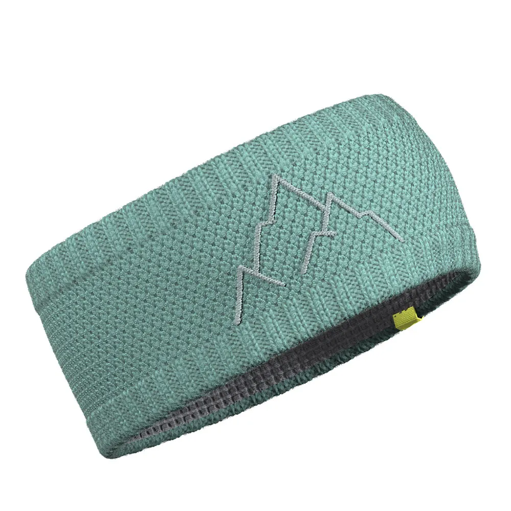 Vinterstrikket pannebånd laget av merinoull med fargekontrastbroderi og et funksjonelt syntetisk fôr på innsiden.