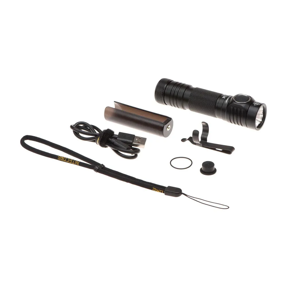 Denne funksjonelle lampen har en hvit CREE XP-L2 V6 LED og SMO-reflektor. Lommelykten bruker et 21700 oppladbart batteri med en kapasitet på 5000 mAh, ladet via en USB-port.