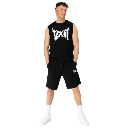 The set consists of a sleeveless t-shirt and shorts. On the front of the t-shirt, the Tapout lettering is printed in a large contrasting colour. The neckline is worked with an elastic grosgrain. The pants have an elastic waistband and can be additionally adjusted with a drawstring. In addition, the pants have two side pockets at the front, a patch pocket at the back and the Tapout lettering is also printed on the left leg.