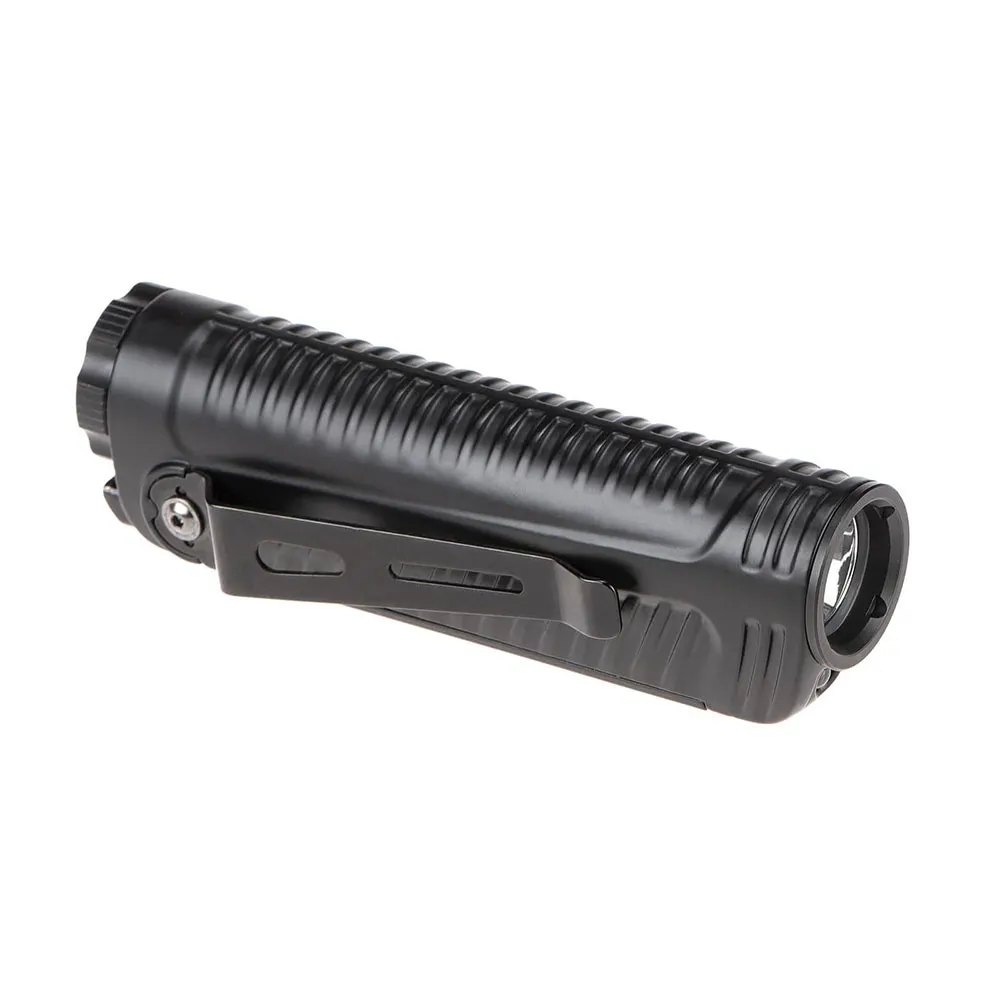 Latarka zapewnia doskonały, obsługiwany jedną ręką interfejs użytkownika. Możesz łatwo zmieniać ustawienia światła dzięki innowacyjnemu i intuicyjnemu, cichemu taktycznemu przełącznikowi tylnemu. Ponadto, boczny przełącznik metalowy steruje przyjaznym dla użytkownika dodatkowym czerwonym światłem do taktyki w słabym świetle/które chroni widzenie nocne.