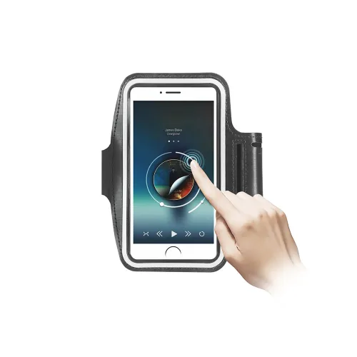 3.Material e toque:correia para o braço é feita de material PVC, suporta ecrã HD e controlo tátil sensível do telemóvel, à prova de água e anti-perfurações, evitando o problema da transpiração durante o exercício.