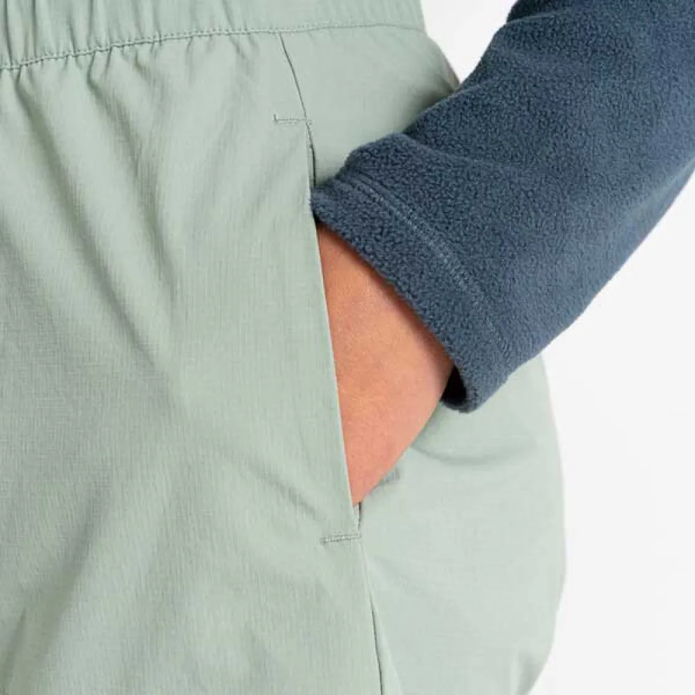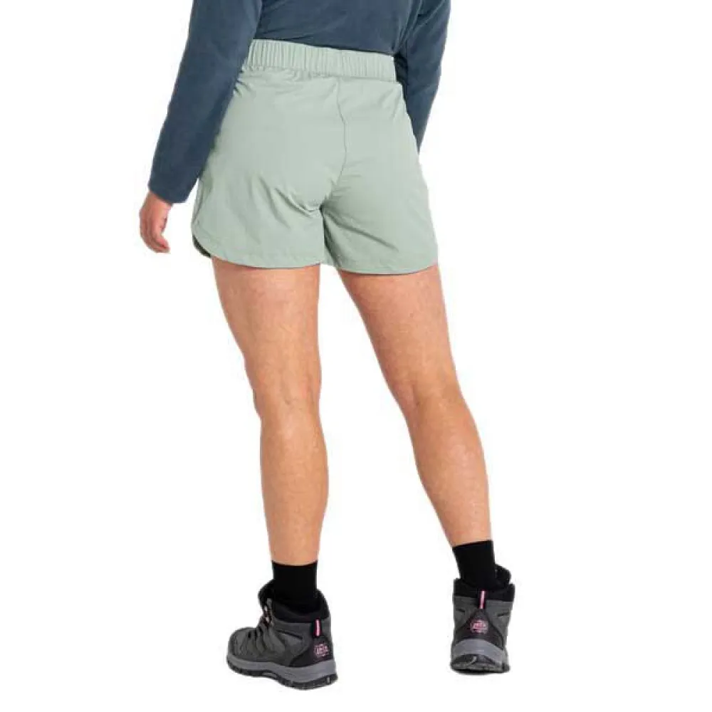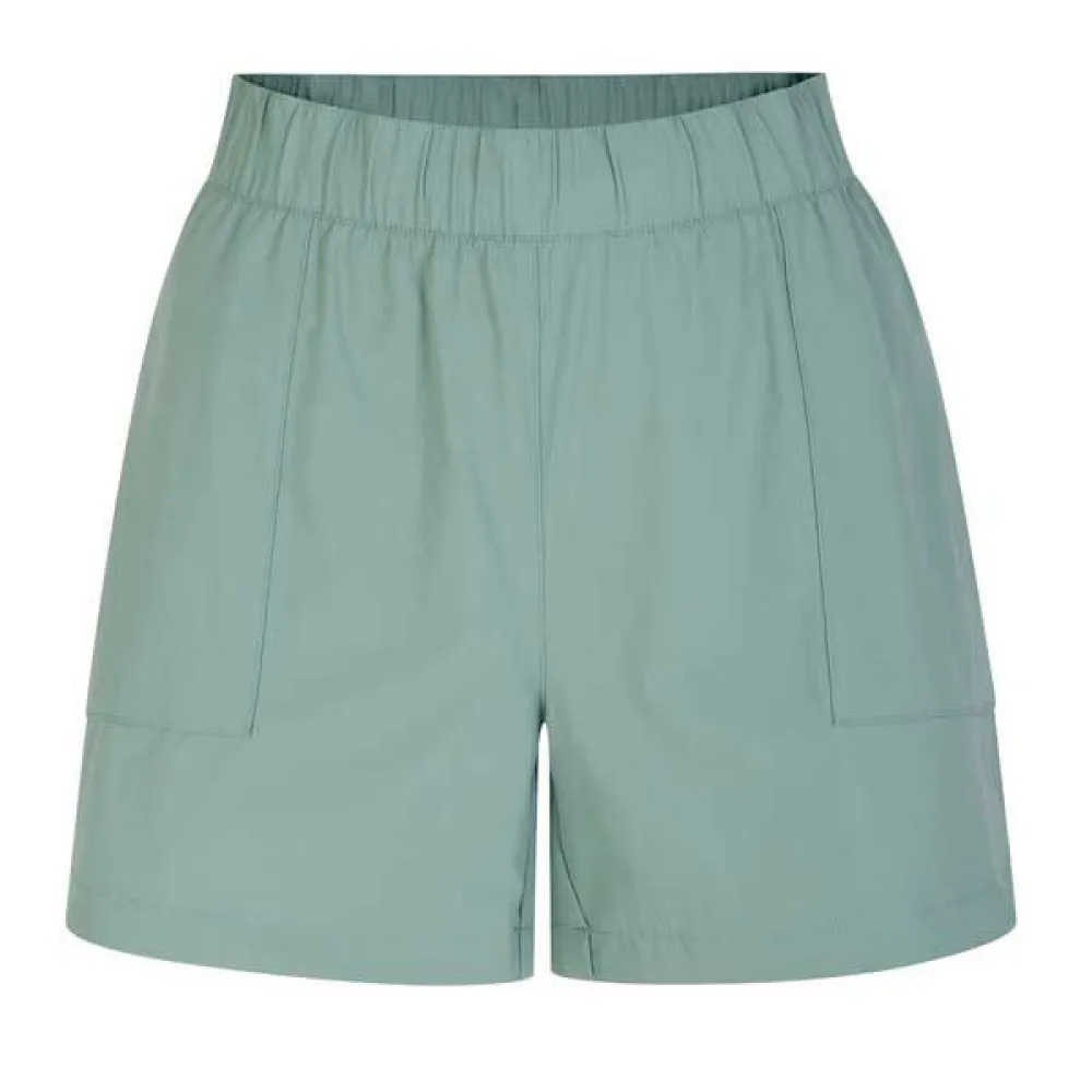 Rapport-shortsen för kvinnor. Dessa shorts med resår i midjan erbjuder en perfekt passform och har 2 öppna sidfickor och en böjd fåll med sidoslitsar. Perfekt för vandringar på sommaren.