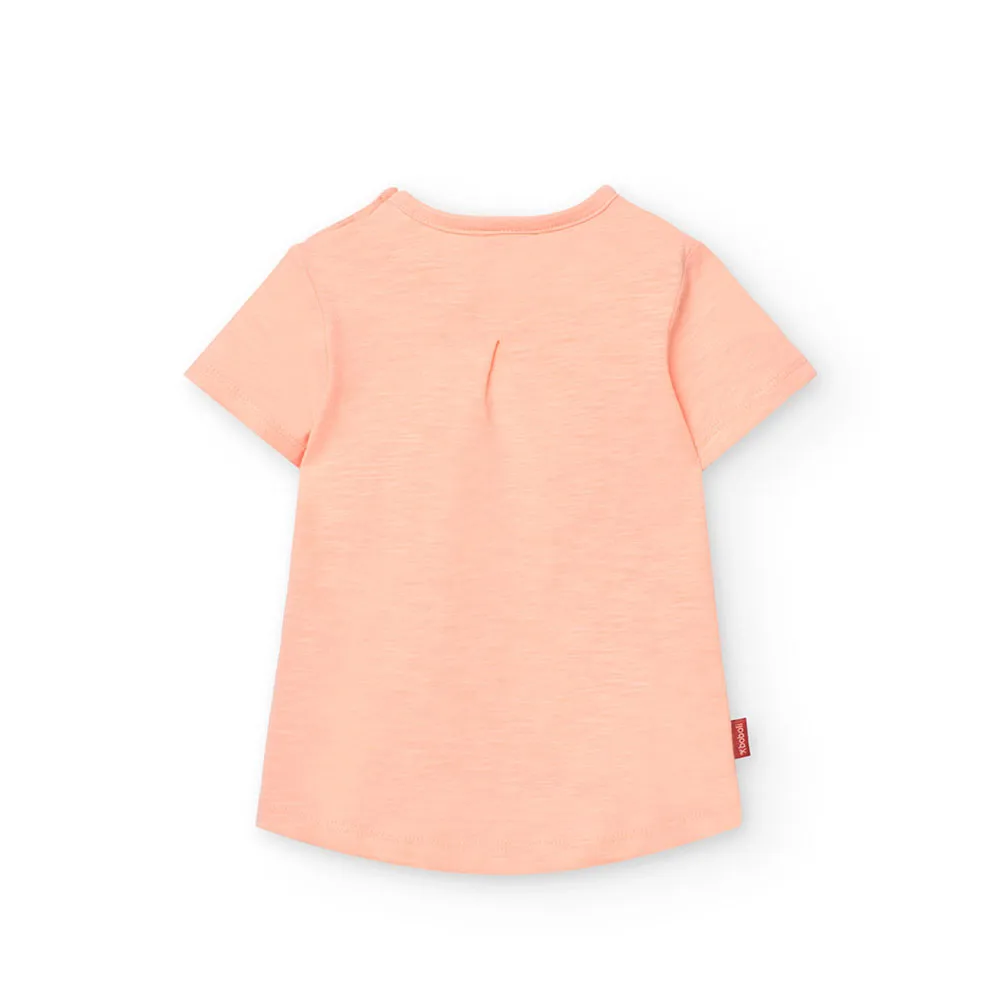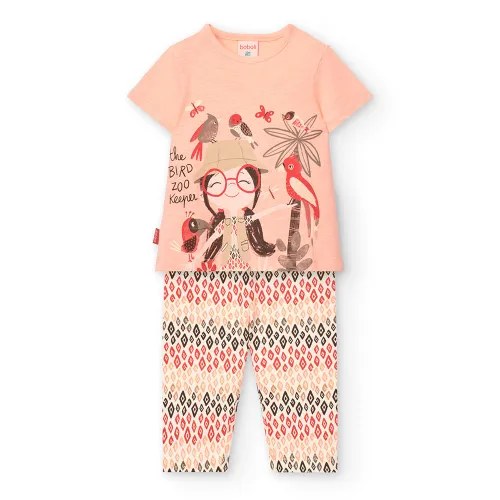 Dies ist ein gestricktes Oberteil und eine Hose in Lachsfarbe für kleine Mädchen, perfekt für die Frühjahr-Sommer-Saison.
