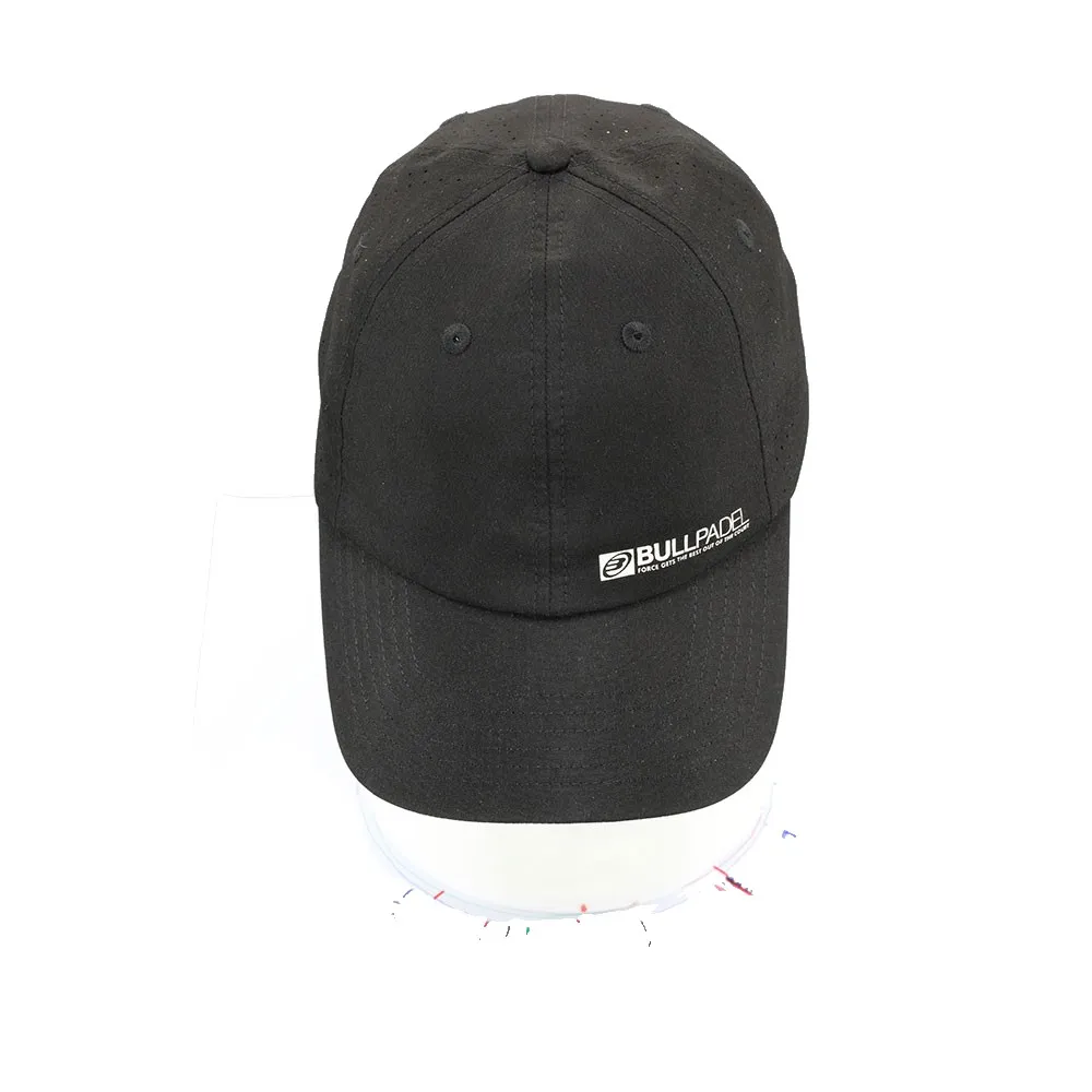 This is a Technical cap. Designed with polyester fabric, with texturing on the back and an embossed graphic. The unique texturing on the rear panels is not just a stylistic choice; it significantly enhances airflow, creating a targeted ventilation system that works with you as your intensity rises. The front of the cap features a bold, embossed Bullpadel graphic, showcasing your commitment to quality and performance with a touch of sophisticated, athletic style. The pre-curved visor is perfectly shaped to shield your eyes from direct sunlight and court glare, improving your visibility and allowing you to track the ball with precision.