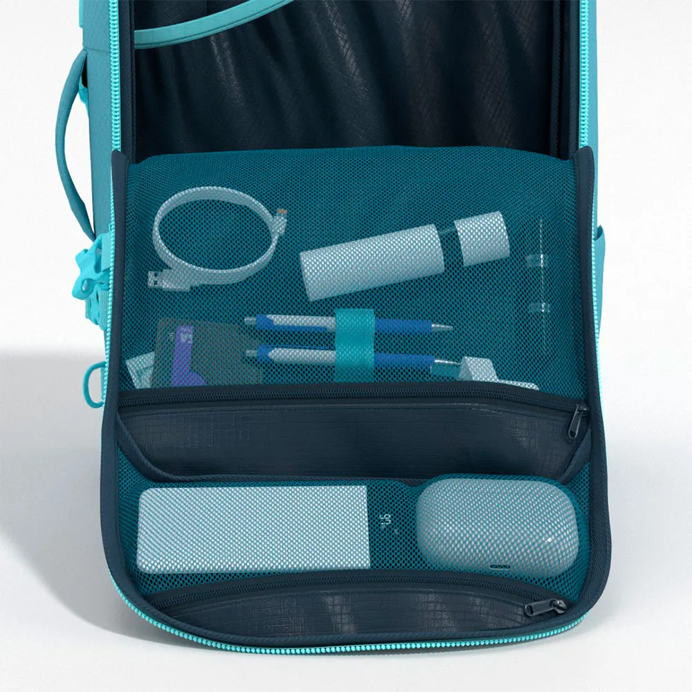 Es kombiniert alle typischen CabinZero-Taschenmerkmale, darunter eine schnell zugängliche Reißverschlusstasche, ein Hauptfach, das von oben oder von vorne beladen werden kann, einen Wasserflaschenhalter und einen verstaubaren Hüftgurt und Schultergurte.