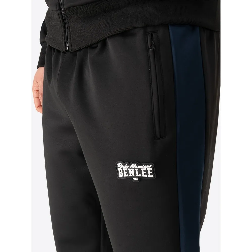 Tracksuit consisting of a full-zip tracksuit jacket, high collar and long tracksuit pants. All hems of the jacket as well as collar and waistband are made of elastic rib material. The jacket has zippered pockets as well as a sewn-on 3D badge on the left chest and a large contrasting BENLEE print on the back. The sporty look is complemented by contrasting inserts on the sleeves that merge into the trouser leg. The pants are equipped with two zippered pockets at the front and a patch pocket at the back. The left trouser leg features the same 3D logo as the jacket.
