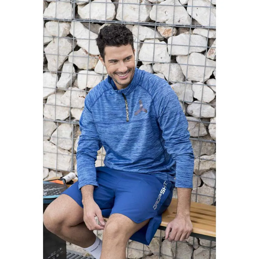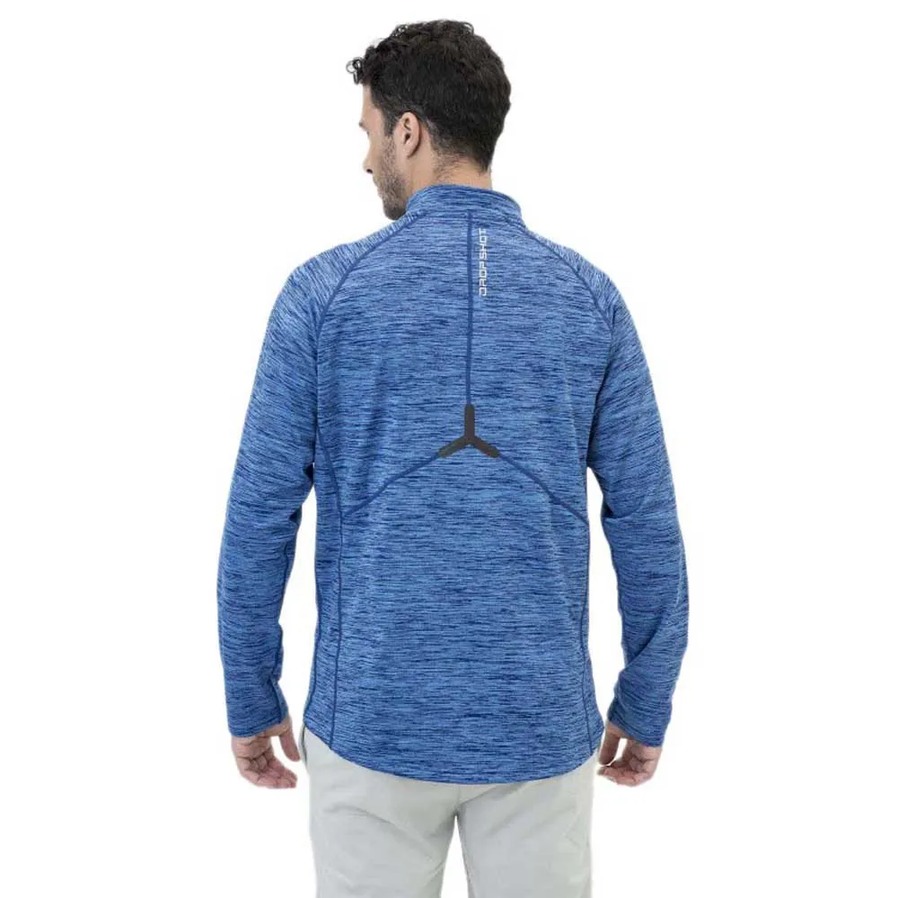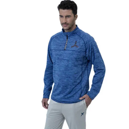 Sudadera en color azul melange, de manga larga, con cuello, ribetes a contraste de color y abertura central con cremallera y logo de la marca a contraste.Parte trasera con figura central, ribetes y logo a contraste de color tanto en parte superior.