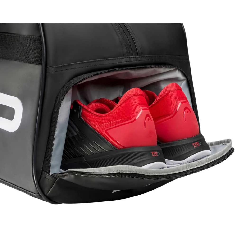 HEAD RACKET Tour 40L Duffle Bag musta/valkoinen on tyylikäs ja toiminnallinen laukku, joka on suunniteltu liikkuville tennispelaajille. Kestävästä materiaalista valmistettu laukku sisältää tilavan päälokeron, johon mahtuu jopa 3-4 tennismailaa ja muuta varustetta. Laukussa on erillinen kenkälokero, jossa kengät voidaan pitää erillään muista tavaroista, sekä useita pienempiä taskuja järjestyksen ylläpitämiseksi. Säädettävä olkahihna ja pehmustetut kahvat tekevät siitä helpon kantaa, olipa kyseessä sitten matka kentälle tai turnaukseen. Tyylikäs mustavalkoinen HEAD RACKET Tour 40L Duffle Bag on täydellinen yhdistelmä tyyliä ja toiminnallisuutta kaikille tennispelaajille.
