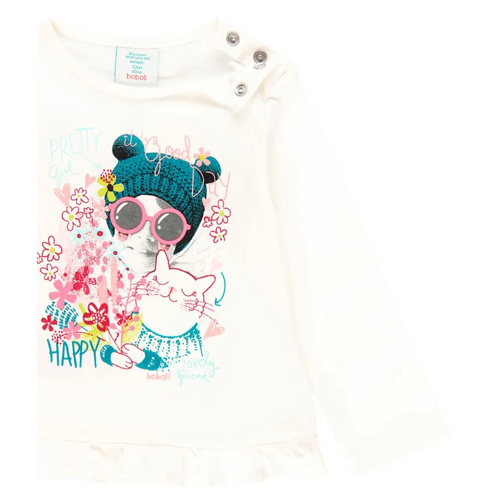 Decorato con una stampa di una bambina con un gatto e fiori in vari colori.