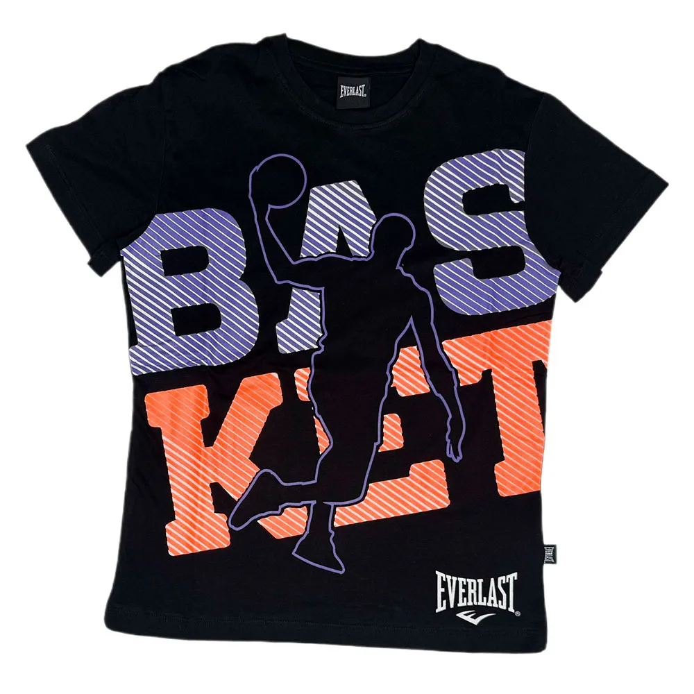 Design semplice di shorts e t-shirt a maniche corte con loghi Everlast discreti e una stampa di una maglietta da giocatore di basket con la parola BASKET.