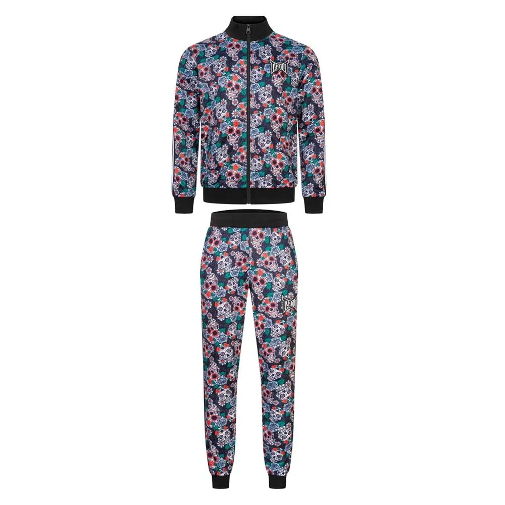 Tuta con stampa all-over composta da giacca e pantaloni. Entrambi i capi presentano un piccolo dettaglio logo a forma di toppa in gomma 3D sul petto o sul lato sinistro della coscia e pratiche tasche con zip. Altri dettagli sono le fasce cucite sui lati e i polsini elasticizzati a coste con coulisse interna in vita.