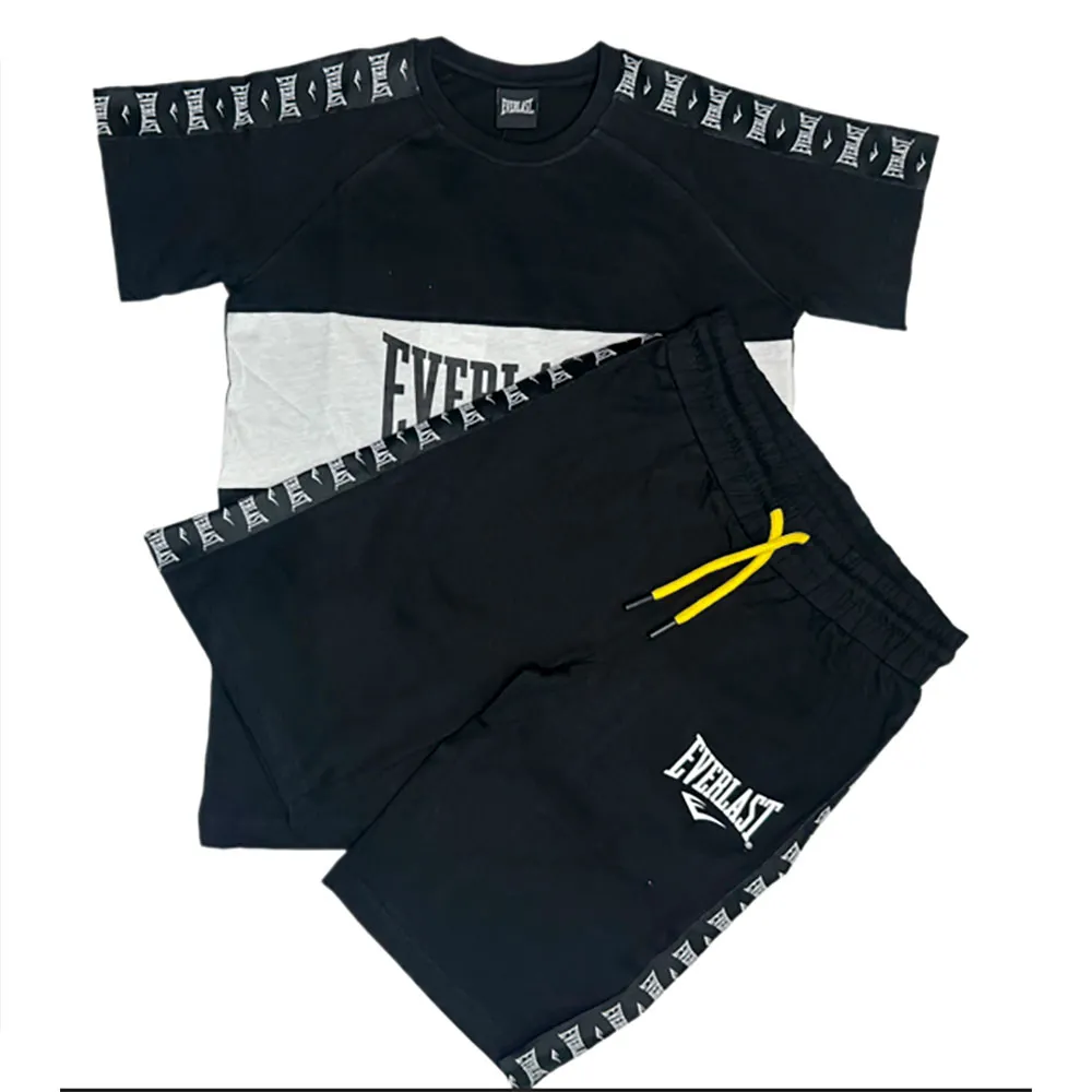 De tee heeft een contrasterende middenstreep met het iconische Everlast-logo in wit, vergezeld van lijnpatronen met de merknaam op de mouwen en zijkanten van de broek, wat zorgt voor een urban en dynamische touch.