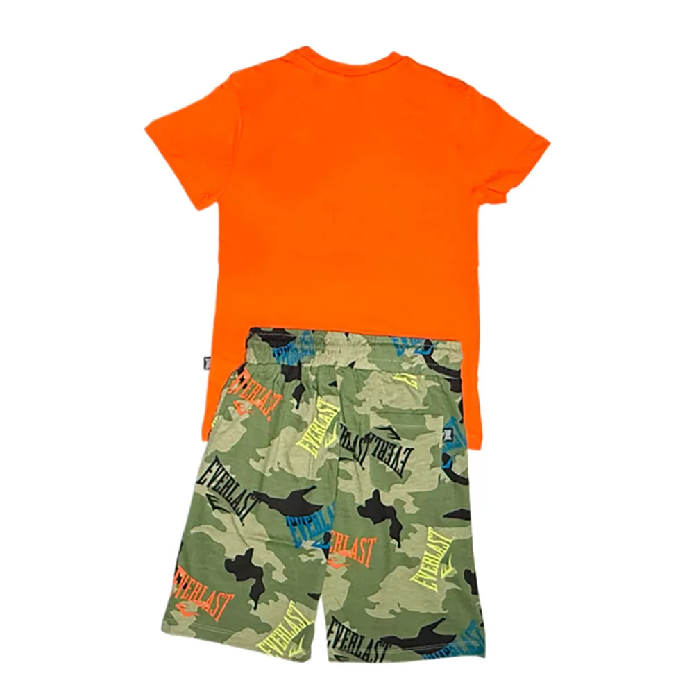 De Everlast Lifestyle Junior T-shirt en Shorts Set voor jongens met korte mouwen en camouflageprint, met een levendig camouflageontwerp met fluorescerende oranje accenten, is de ideale keuze voor actieve jongens die op zoek zijn naar stijl en comfort.