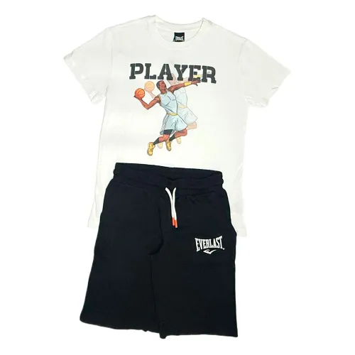 Simpel ontwerp met shorts en een t-shirt met korte mouwen in zwart met subtiele Everlast logo´s en een basketbalspeler print.