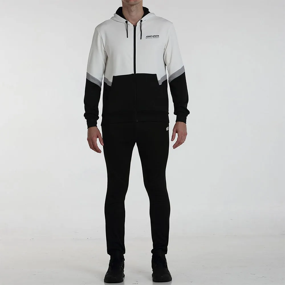 Visueel gezien maakt het trainingspak een statement met zijn dynamische, sportieve esthetiek. Opvallende contrasterende panelen lopen langs de zijkanten, breken de effen kleur en voegen een vleugje moderne flair toe. Een kenmerkende print op de borst toont trots het JOHN SMITH-merk, wat staat voor kwaliteit en sportieve erfgoed. Voor praktisch gebruik is de jas uitgerust met een ruime kangoeroezak, perfect om je handen warm te houden of om essentiële spullen zoals je telefoon, sleutels en portemonnee in op te bergen.