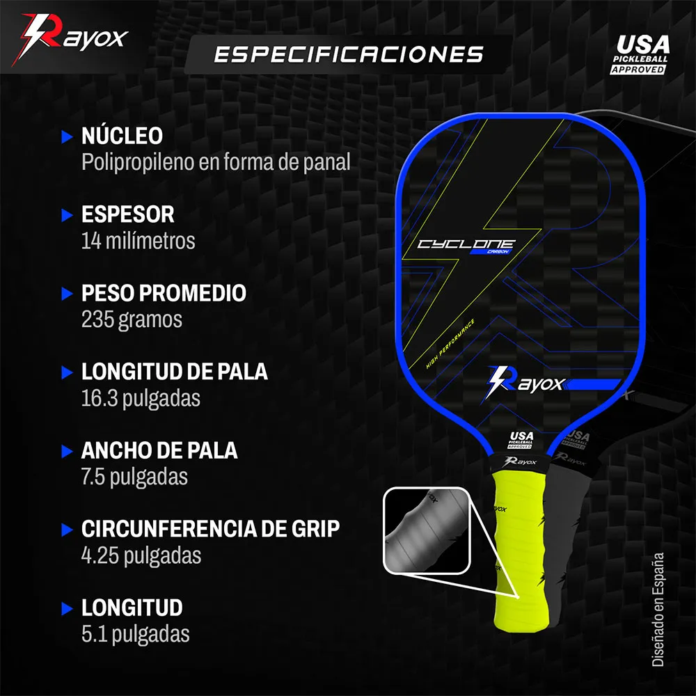 Til je spel naar een hoger niveau met onze Rayox Cyclone. Dit paddle is ontworpen met een meerlaags E-Glass-glasvezel oppervlak en een honingraatkern en biedt superieure controle en de mogelijkheid om met gemak spin toe te passen. Perfect voor beginners en spelers in ontwikkeling.