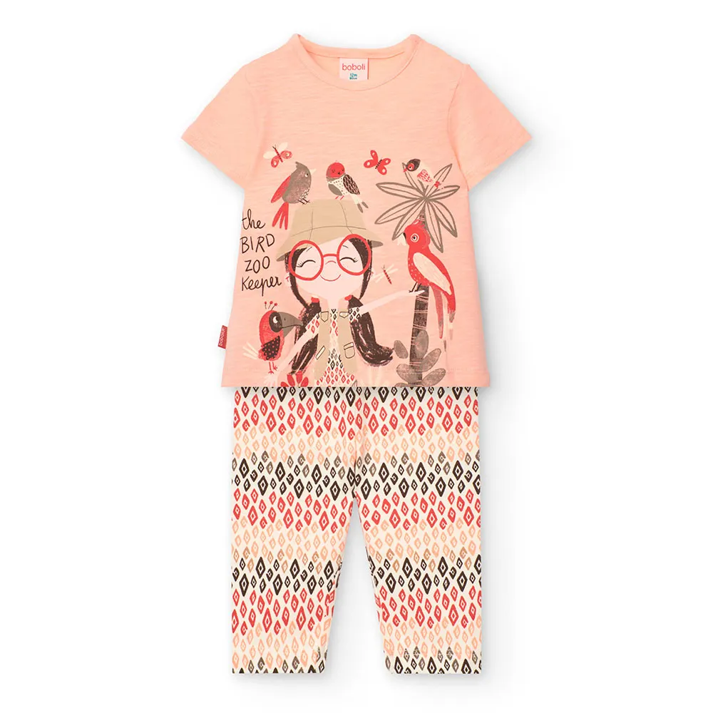 To jest dziewczęcy zestaw dla niemowląt składający się z dzianinowej bluzki i spodni w kolorze łososiowym, idealny na sezon wiosenno-letni.