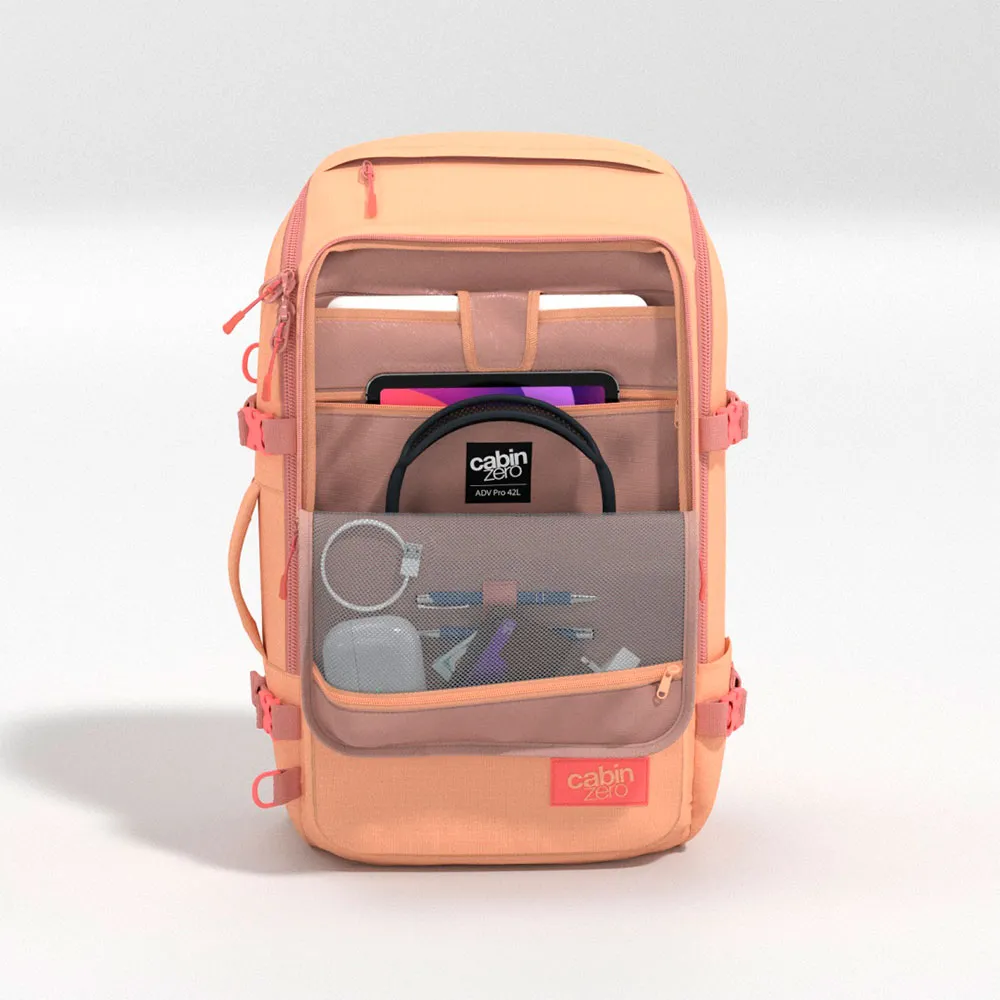 Wytrzymały i praktyczny, posiada wszystkie charakterystyczne cechy CABINZERO, w tym szybkodostępną kieszeń na zamek, komorę główną, którą można ładować od góry lub od przodu, uchwyt na butelkę z wodą oraz chowany pas biodrowy i szelki.