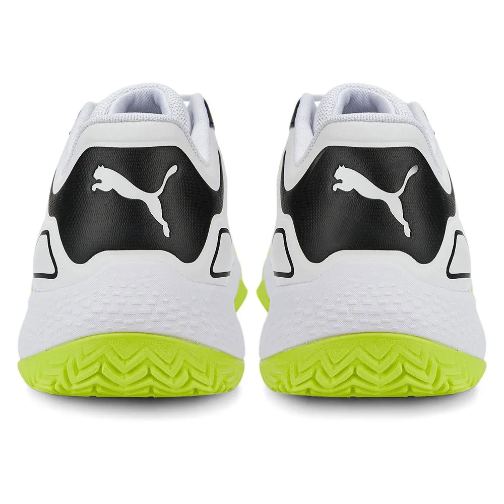 Przenieś swoje umiejętności na nowy poziom dzięki nowemu sprzętowi do rakiet PUMA. Lekkie materiały wierzchnie wzmocnione trwałymi warstwami ochronnymi są połączone z responsywnymi technologiami amortyzacji, aby zawsze wyprzedzać grę. Nowe wzory gumowego bieżnika zapewniają wielokierunkową przyczepność i trakcję, umożliwiając szybką zmianę kierunku. Odblokuj szybkie ruchy i zdominuj grę.