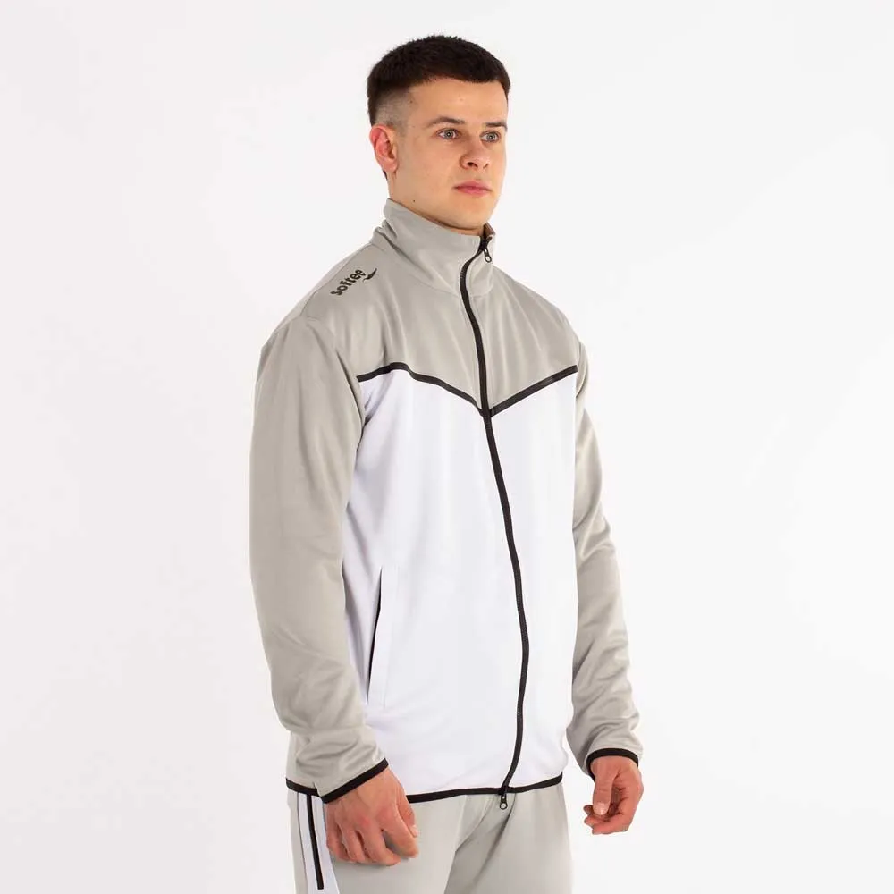 Dwukolorowy dres w nowoczesnym sportowym stylu, składający się z kurtki i spodni. Kurtka ma długie rękawy i pełny zamek błyskawiczny z przodu. Kolor jest kolorem dominującym, z detalami na kołnierzu i rękawach pasującymi do spodni. Kurtka ma dwie kieszenie zapinane na zamek, podobnie jak spodnie. Spodnie mają również elastyczny pas ze sznurkiem dla idealnego dopasowania. Prosty krój, bez mankietów. Kurtka wykonana jest w 100% z poliestru, a spodnie w 90% z poliestru i 10% z elastanu.