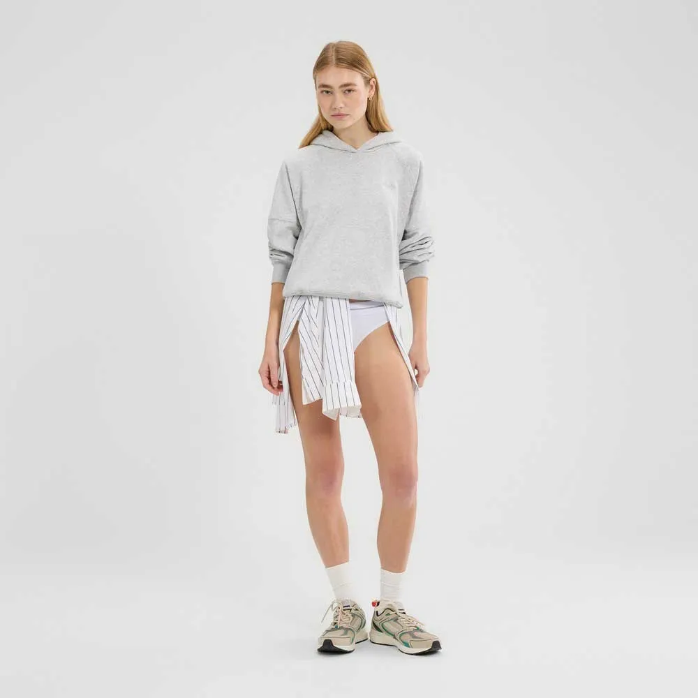 A funcionalidade encontra o design icônico com a inclusão de um espaçoso bolso canguru frontal. Este recurso clássico não apenas aprimora a vibe relaxada do moletom, mas também serve como um lugar conveniente para aquecer as mãos ou guardar pequenos itens essenciais, como seu telefone e chaves. Para garantir um ajuste perfeito que permaneça no lugar, o Moletom com Capuz Liscia é finalizado com punhos canelados profundos e uma bainha canelada correspondente. Este detalhe de construção ajuda a reter o calor, mantendo a forma da peça, proporcionando uma sensação estruturada, mas confortável, que se move com você.