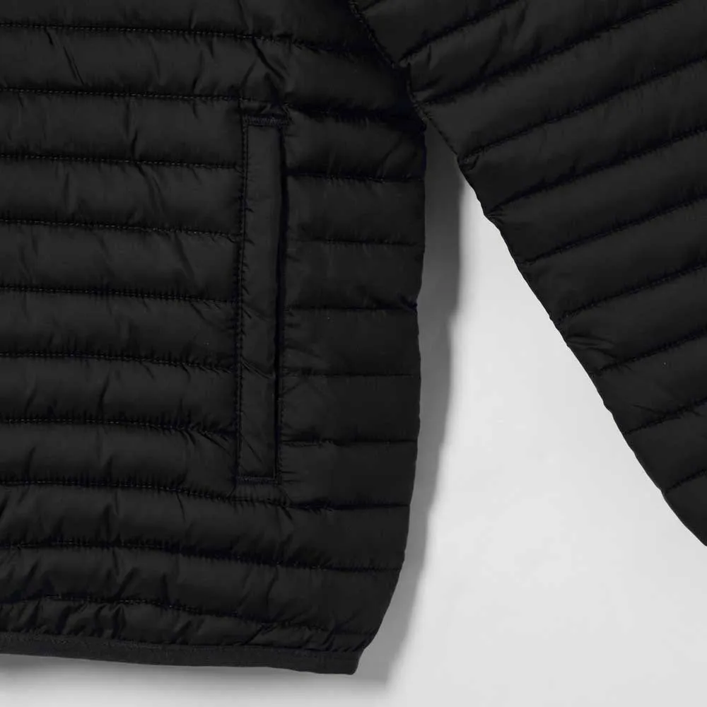 Isolerad konstruktion: Horisontell quiltad vaddering över hela kroppen och ärmarna ger utmärkt termisk effektivitet och en klassisk pufferlook. Full dragkedja: En slitstark dragkedja i full längd löper från fåll till haka, vilket erbjuder mångsidig styling och enkel på- och avtagning.