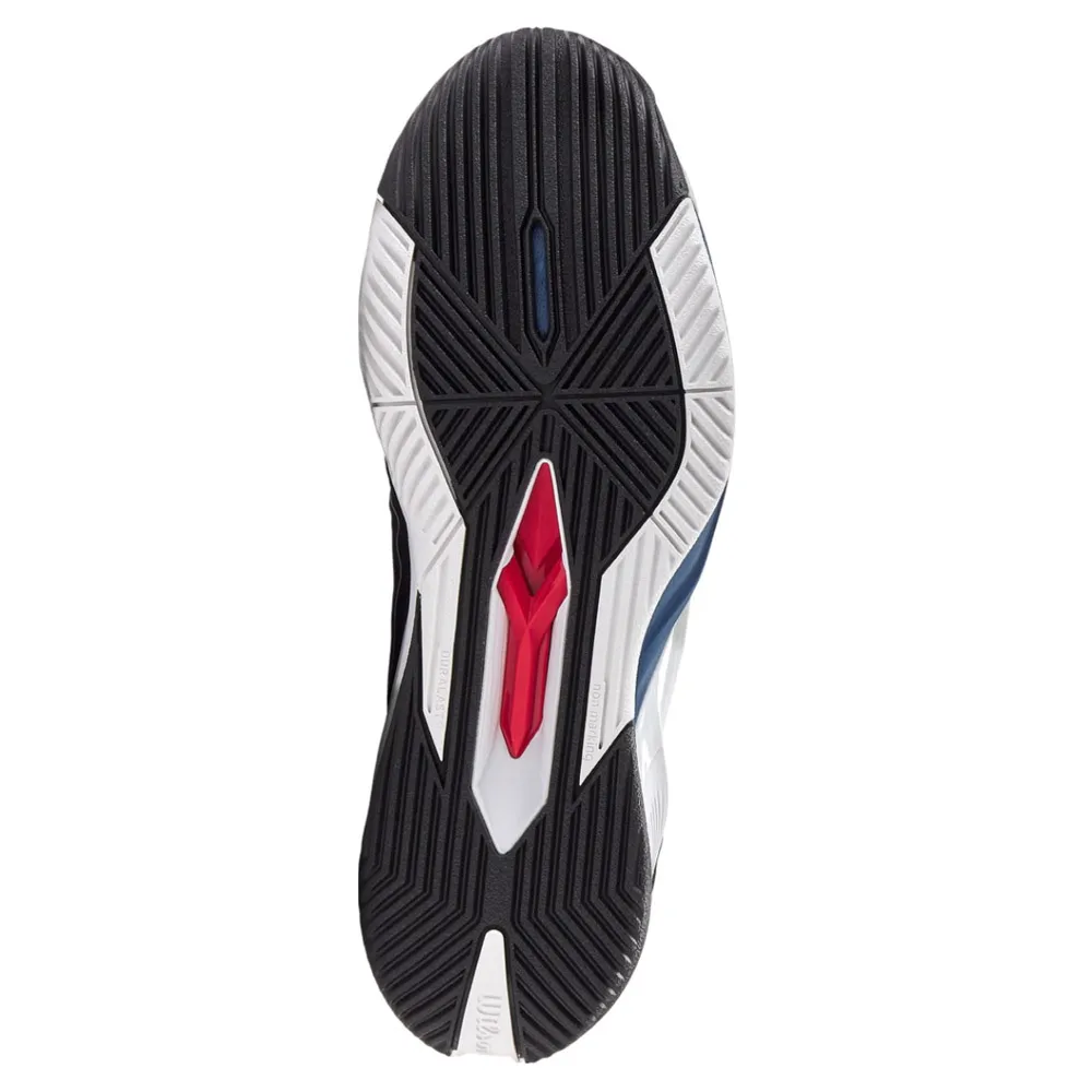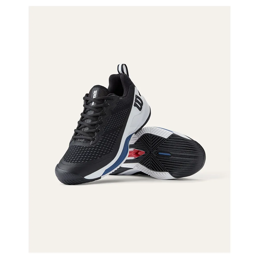 WILSON Rush Pro 4.5 all court-skor i svart/vitt/flaggblå är ett stilfullt och högpresterande alternativ för alla manliga tennisspelare. Dessa skor har en slank design med en svart, vit och flaggblå färg som gör att du sticker ut på banan.