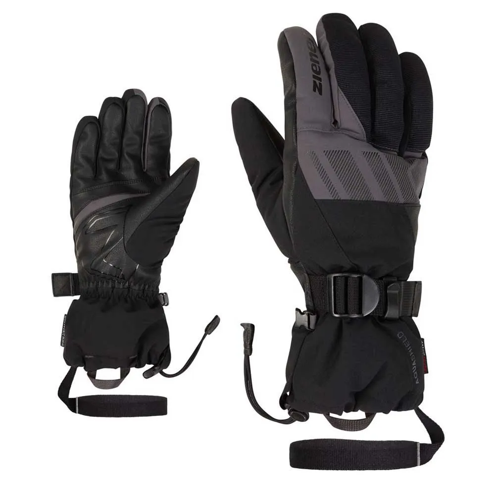 De sporty Ziener herre-skihandsker GHALION AS® er udstyret med en åndbar, vandtæt og vindtæt ZIENER AQUASHIELD® membran. Det varme plysfor gør handsken ekstra varm og sikrer et behageligt tørt og varmt klima i handsken, selv på kolde dage. Den lange manchet forhindrer sne i at trænge ind. Snøresystemet gør det muligt at fastgøre handskekanten over jakkeærmet med én hånd. Elastisk håndledsrem og webbing-lukning er inkluderet. Handsken er PFC-fri.