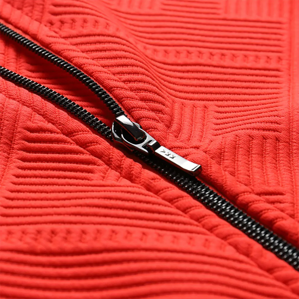 durchgehender langer kontrastierender Reißverschluss, Kinnschutz, Taschen insgesamt 2, Vordertasche mit Reißverschluss, Aufdruck auf der Vorderseite.