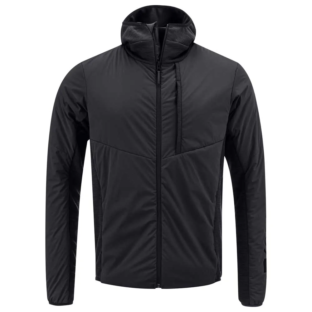 Off-piste, you can move freely and keep warm with the KORE INSULATION JACKET MEN. Made with stretch fabrics, the technical hybrid midlayer stretches with you. For enhanced performance, there is elastic binding on the cuff, hem, and a fixed, fitted hood, as well as stretch fleece inserts with merino wool content on the sides and under the arms for improved breathability. The jacket also features flatlock seams and a premium finish on the inside.
