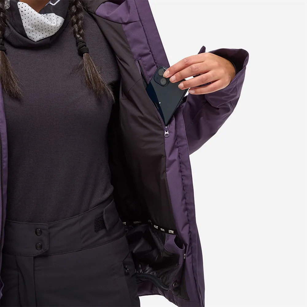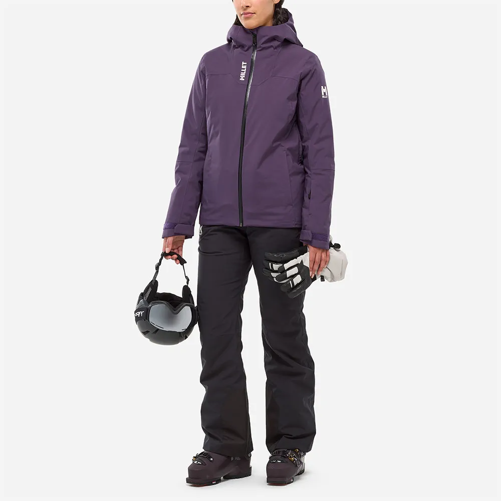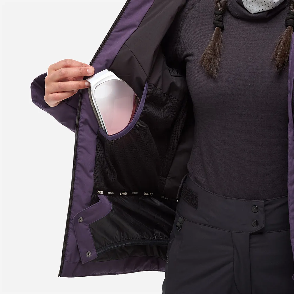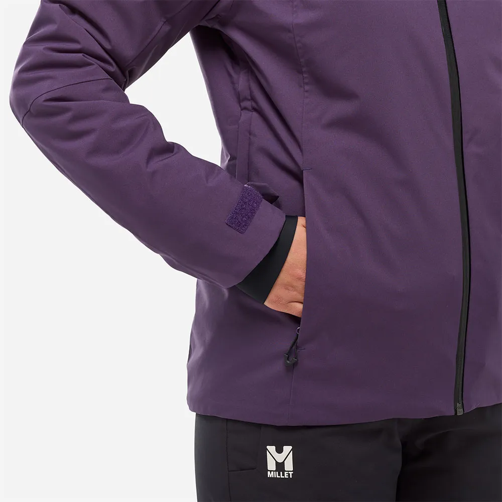 Conquer the mountain in the MILLET Brevent ski jacket. Designed with a flattering feminine cut, it combines style with high performance. Stay warm and dry thanks to its fully waterproof DRYEDGE™ 20K/20K fabric and 100% recycled REPREVE® insulation. The 2-way stretch material ensures total freedom of movement, while side vents let you regulate your temperature. Packed with functional pockets for your ski pass and goggles, this versatile jacket is perfect for the slopes and everyday winter adventures