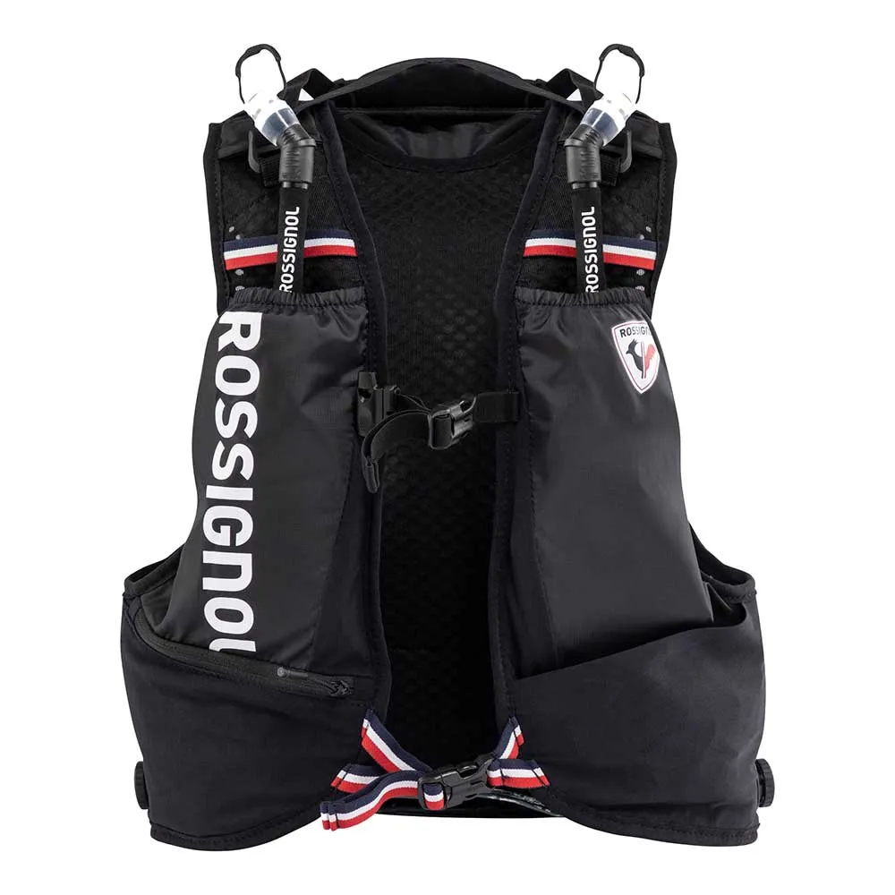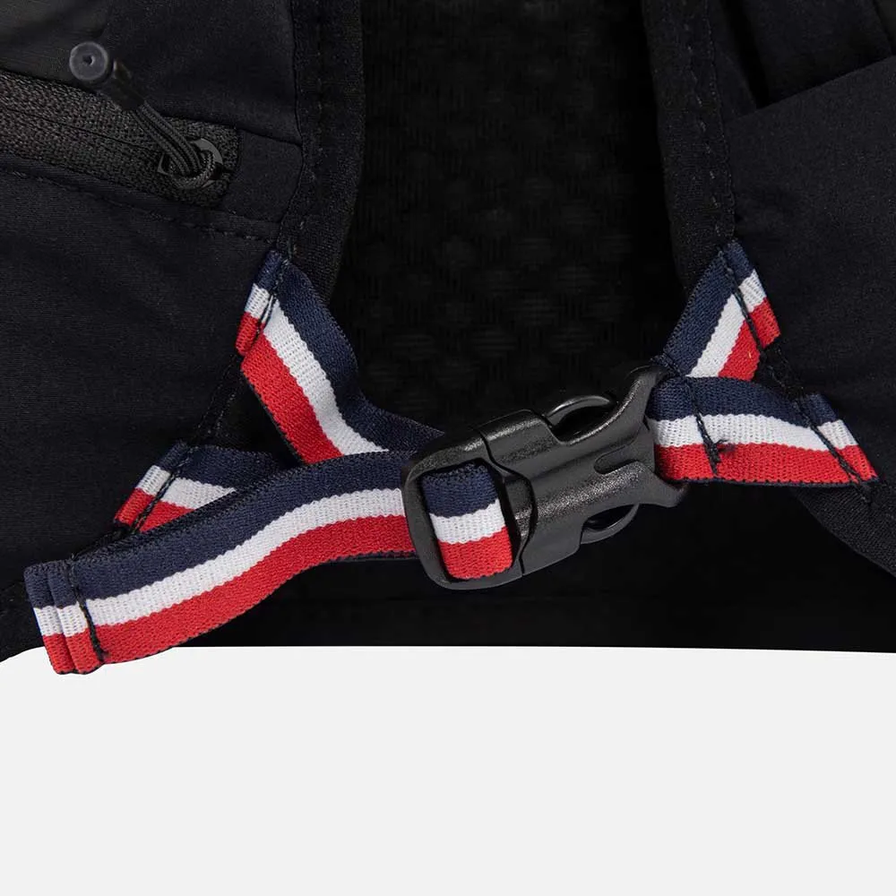 Hit the trail with everything you need to go big and stay hydrated. This Rossignol versatile vest is a must-have layer for long distance trail runs, mountain biking or cross-country skiing. The lightweight design includes dedicated front storage pockets for two water flasks (included) plus space for a larger volume hydration bladder. A dial fit system offers fast, reliable on-the-fly adjustment for a secure fit. Our exclusive and removable pole quiver design securely carries two poles on top of the back pocket. Just flip it forward for quick access to your poles. Drop-in pockets let you grab gels on the fly, and a secure pocket holds valuables and a key. A built-in safety whistle adds peace of mind.