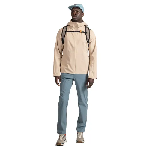 The three-layer shell construction seals out wind and rain, while laser-cut underarm vents enhance breathability for hiking.