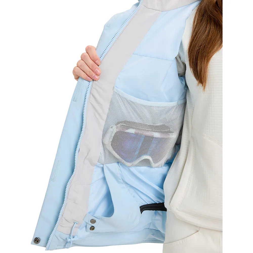 Pockets:2 zippered handwarmer pockets with key clip, chest pocket with media port, sleeve pass pocket, internal mesh goggle pocket.