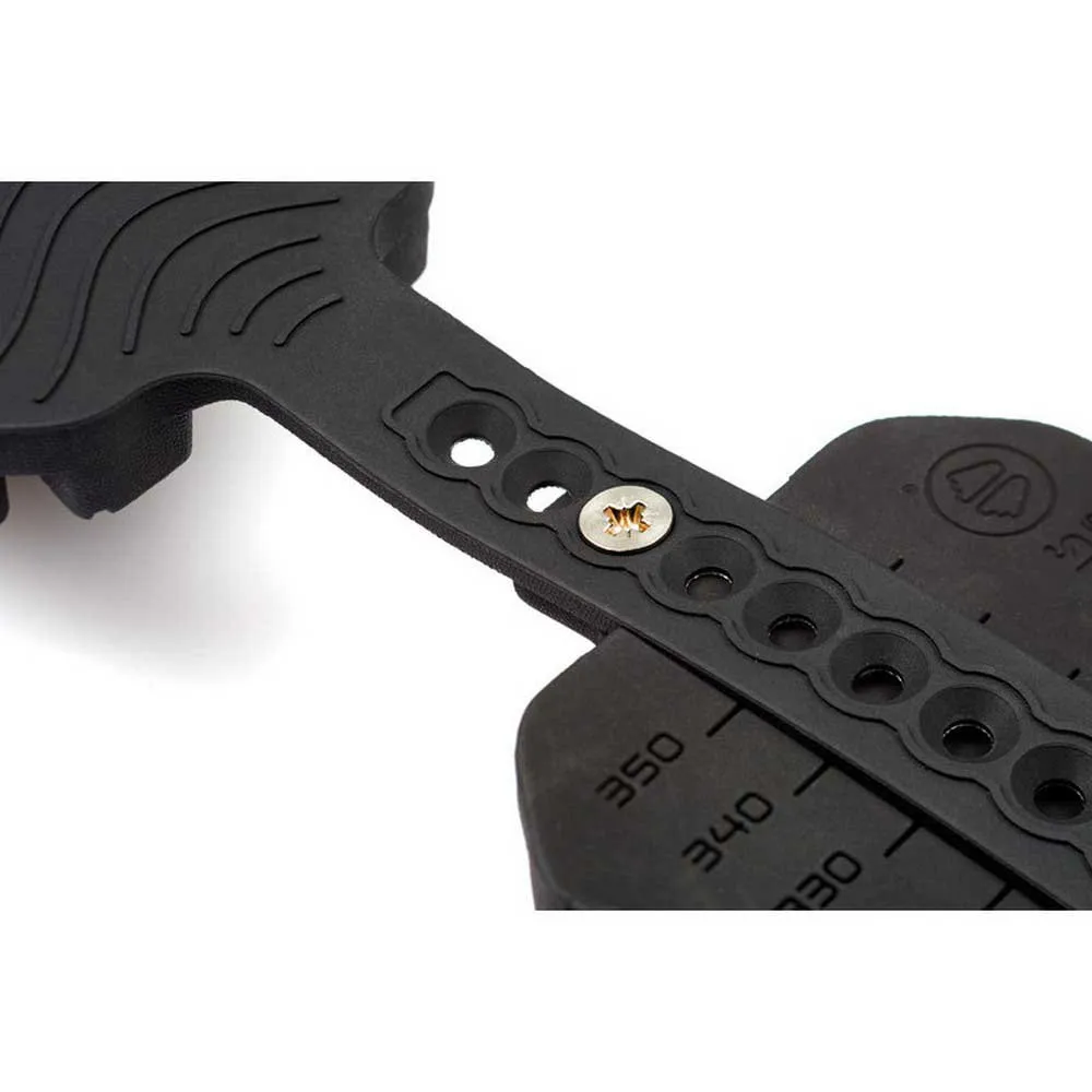 For size adjustment, check the length of your ski boot in mm, adjust the Ski Boot Traction device to the corresponding size (round down, the tip of the arrow indicates the size selected) and screw in with a Phillips screwdriver.